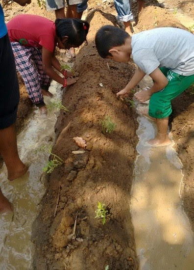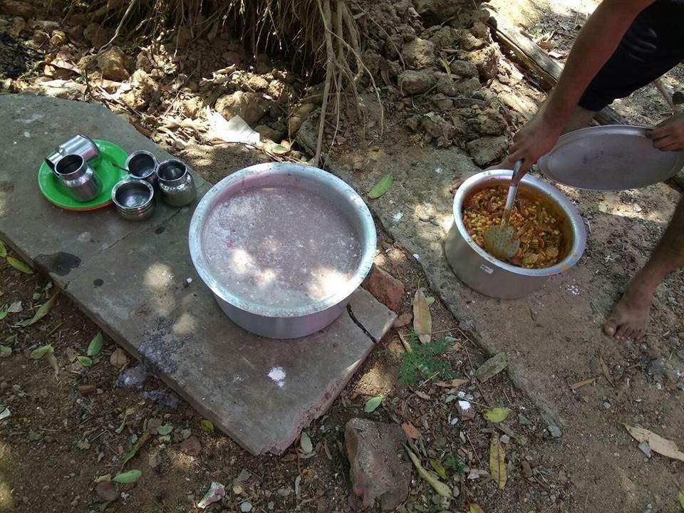 After the plantations, we took a break for breakfast. The breakfast consisted of “Koozhu” (in semi solid/liquid form made from Ragi, Rice, Curd and Onions) which was healthy and delicious at the same time. We savored every bit of it and thanked “Anita” and her family, for preparing such an awesome meal. There were other heavenly dishes like a beans tomato gravy with radish drumsticks and brinjal. One dry green veggie in gram flour. The fried chilies that were not spicy but tasted yumm. Also we had cut mango with salt and chilly, fresh from backyard’s mango tree.