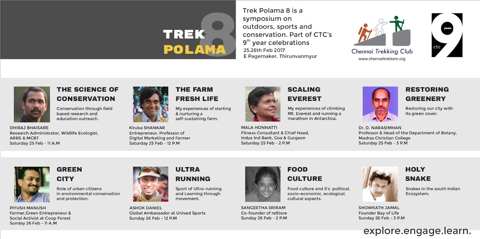 Trek Polamaa III, Mar 2012, 2-day symposium to create awareness on outdoors, nature and conservation in Chennai inviting various eminent speakers in the Industry attracting more then 1000+ visitors covered by Deccan Chronicle and The Hindu Metro Plus and Jaya TV